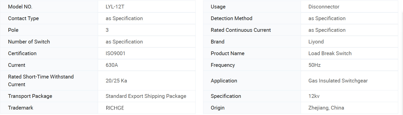 Lyl-12T жүктеме қосқышы GB3804-2004 «3,6 кВ ~ 40.5кВ жоғары кернеудің жоғары кернеуі» және GB16926-1997 «Айнымалы ток жоғары кернеулі сөндіргішті пайдаланыңыз». Негізгі тізбек: 630а-20ка (4S), 25KA (3S); Механикалық өмір: 5000 рет; Жерге қосу тізбегі: 20KA (2S); Механикалық өмір: 2000 рет.