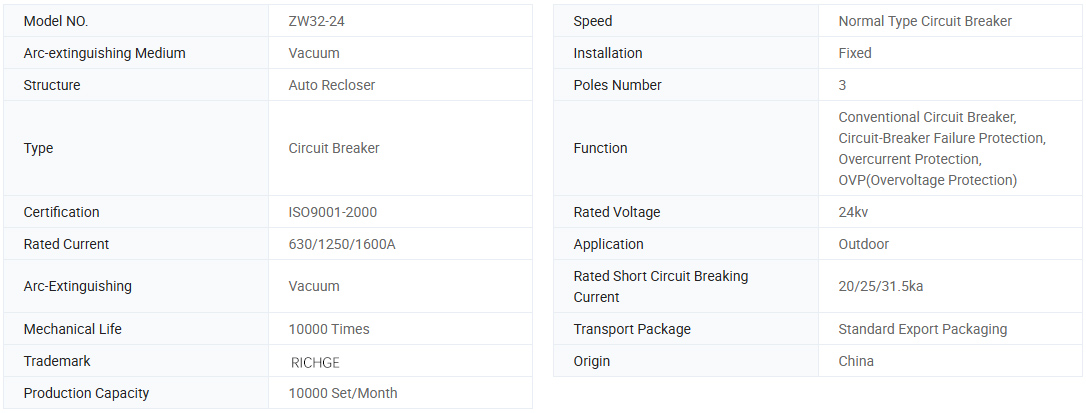 ZW32-24 сериясы жоғары кернеуді вакуумды сөндіргіш, 50 Гц, кернеуді, тәулік бойы, ток, шамадан тыс және қысқа тұйықталуға арналған үш фазалы қуат жүйесі қолданылады. Ажыратқыш контроллерді басқарумен қамтамасыз етілуі мүмкін. Өзін-өзі ұсынған PT Қуат көзі ретінде, ол кернеудің және ағымдағы қуат көзі бар контролсерге айналады.