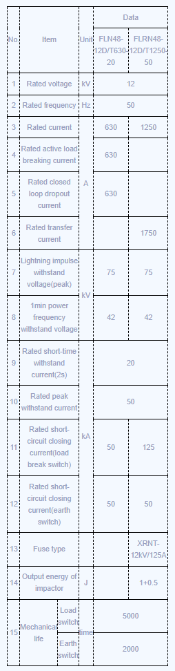 FLN48-12D типінің техникалық параметрлері, жабық HV SF6 жүктеу үзілісі