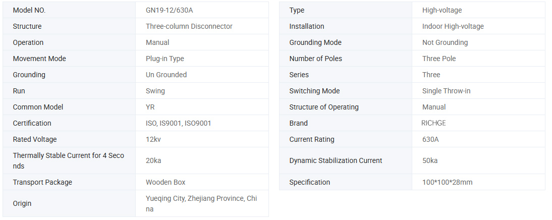 GN19-12 / 400, 630, 1000, 1250 типті ажыратымдылық қосқышы әр фаза үшін екі тірек оқшаулағыштарының негізіне бекітілген. (GN19-12C / 400, 630, 1000, 1250 түрі бір тірек оқшаулағыштары бар және бір фарфордан жасалған оқшаулағыш бар.) Үш фаза параллель орнатылады, ал өткізгіш бөлігі контактілердің пышақтары мен контактілерді ұстаушылардан (немесе өткізгіш өзектерден) тұрады. Контакт пышағының әр фазасы галстук оқшаулағыштың ортасына қосылған, оқшаулағыш байлаңыз және қосылған шпиндельдің түбіне орнатылған. Шпиндель қосылатын ROD (пайдаланушы берілген) және CS6-1 қозғалмалы механизм түріне тұтқасы арқылы қосылған. Байланыстыратын контакт пышағы екі сықылған мыс табақшадан тұрады, бұл төменгі температураны төмендету үшін контакт пышағының жылу бөлігін арттырады, сонымен қатар коммутатордың динамикалық тұрақтылығы жақсарады. Контакт пышағының бір ұшында контакт блогына (немесе өткізгіш өзекке) бекітілген болтпен (орамал) бекітіледі. GN19-12 / 1000, 1250 магниттік құлып тақтайшасын орнатумен байланыста, сонымен қатар магниттік құлып тақтайшасының мақсаты - аралығындағы екі ойық пышақты жақсарту үшін үлкен қысқа тұйықталу тогы тарту. GN19-12 / 400, 630 ажыратқышы ток арқылы аз ғана шектеулер бар, сондықтан магниттік құлыптау тақтасын қосудың қажеті жоқ.