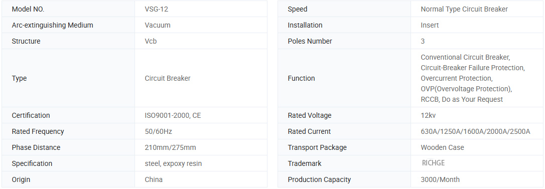 VSG-12 типі Ішкі вольтты вакуумдық сөндіргіш Көктемді сақтауға дейін қолданды. Пайдалану механизмі екі жолмен жұмыс істей алады, сипаттамалары GB1984-2003 жоғары кернеулі, jb3855-1996.